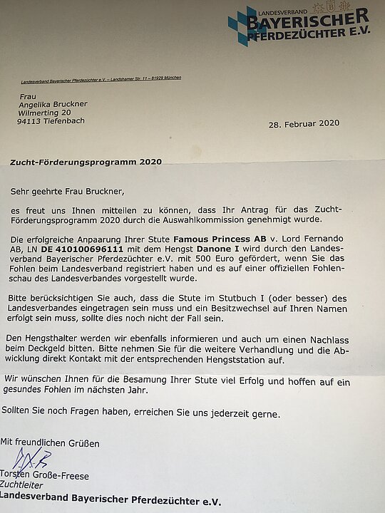 Bayerischer Pferdezuchtverband hat Bezuschussung bestätigt.