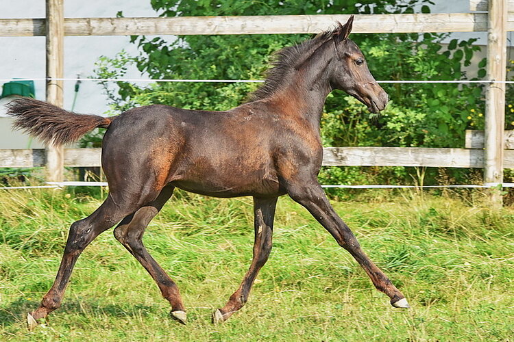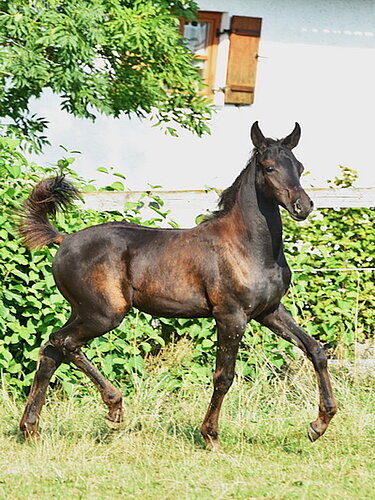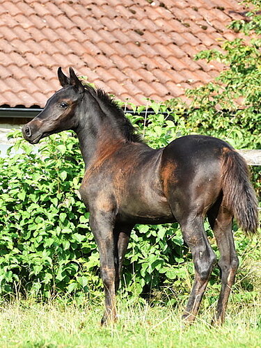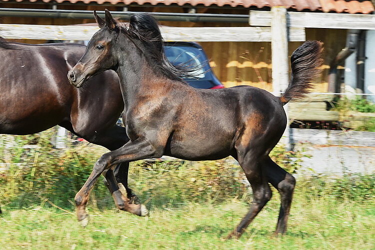 Alim ist ein homozygother Rapphengst der sich zu präsentieren weiß. Er hat viel Aufrichtung und erinnert wenn er sich in Bewegung setzt sofort an ein sehr gutes Dressurfohlen. Alim ist äußerst korrekt wie alle Asala Amir Raa Kinder, auch sein Charakter ist wie alle seine Amir Geschwister, super menschenbezogen und ein super süßer kleiner Draufgänger der die Welt frech, frei und froh erkundet.