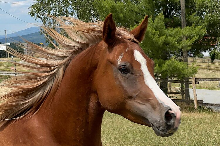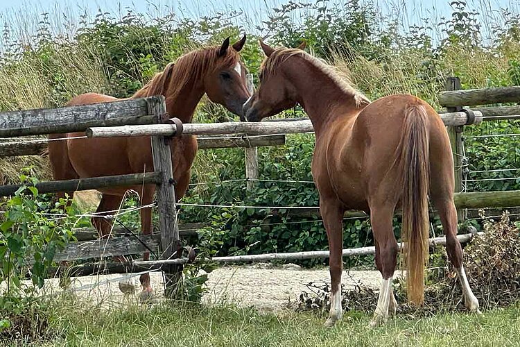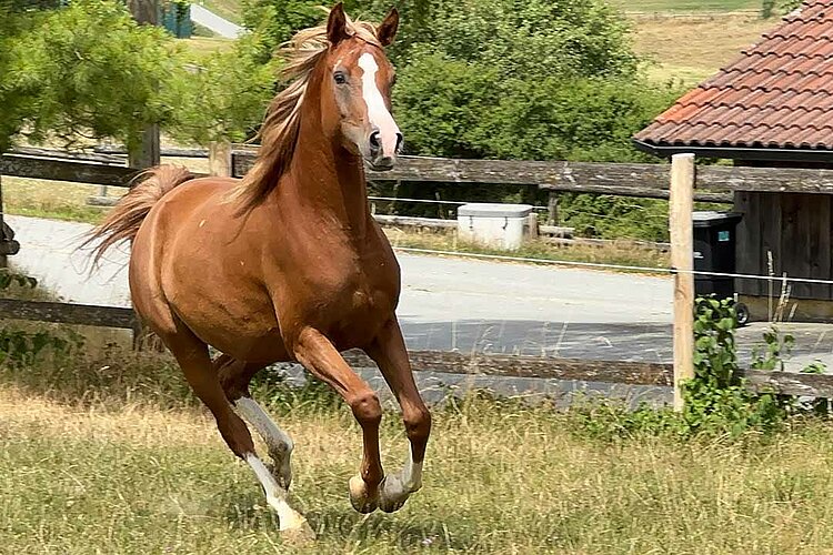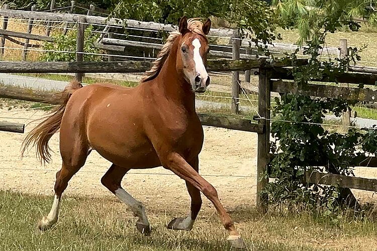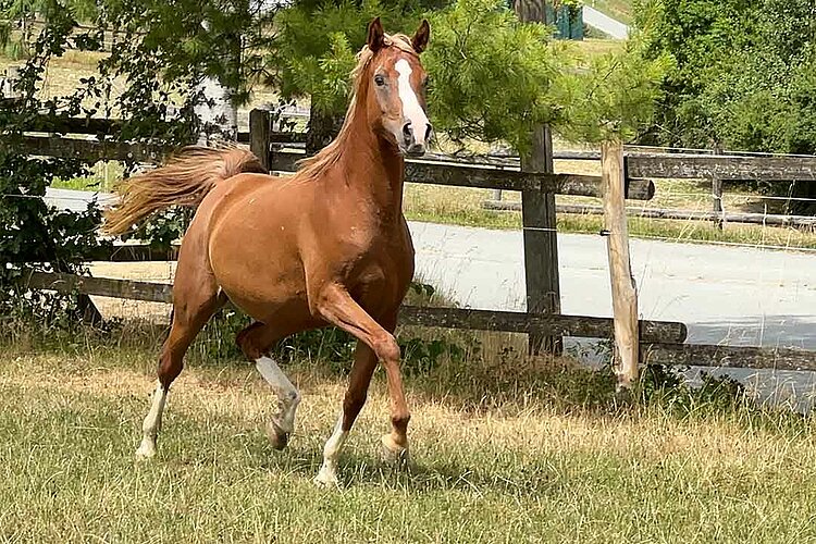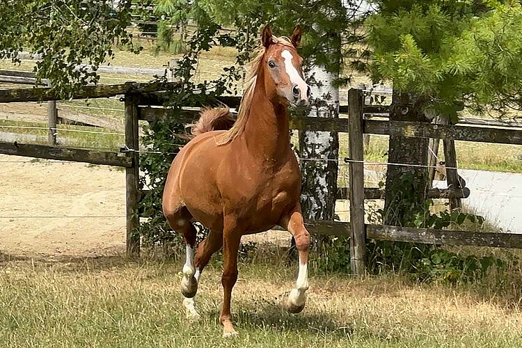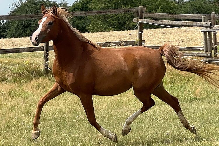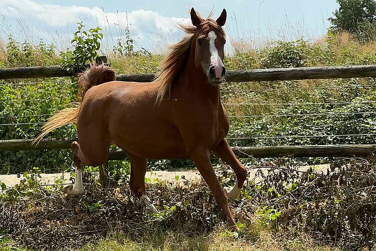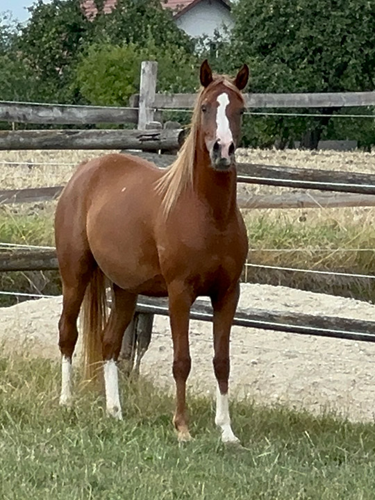 Sie ist eine rahmige Stute mit einer enormen Gurttiefe und ihr hervorragender Trab wurde auf der Prämierung mit 9,0 bewertet.
