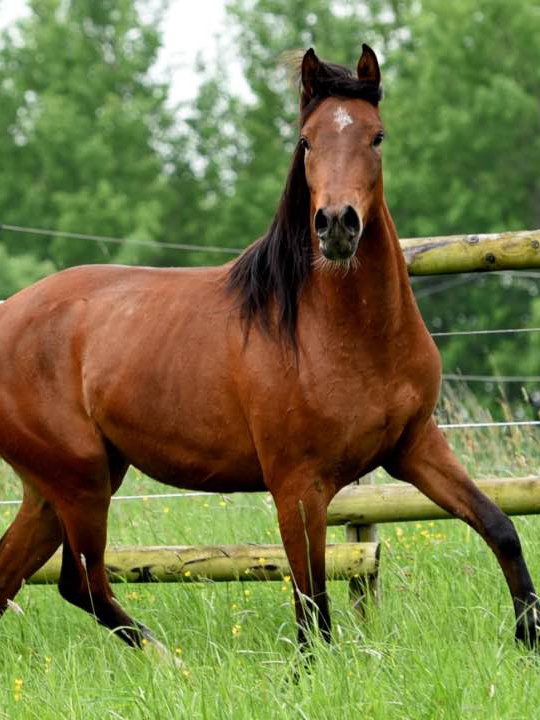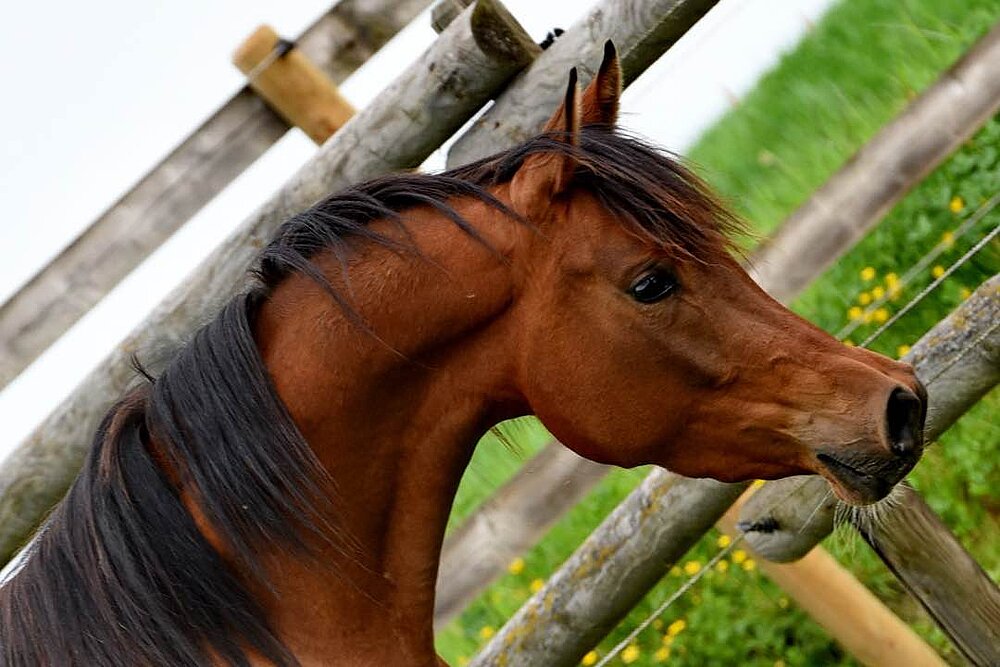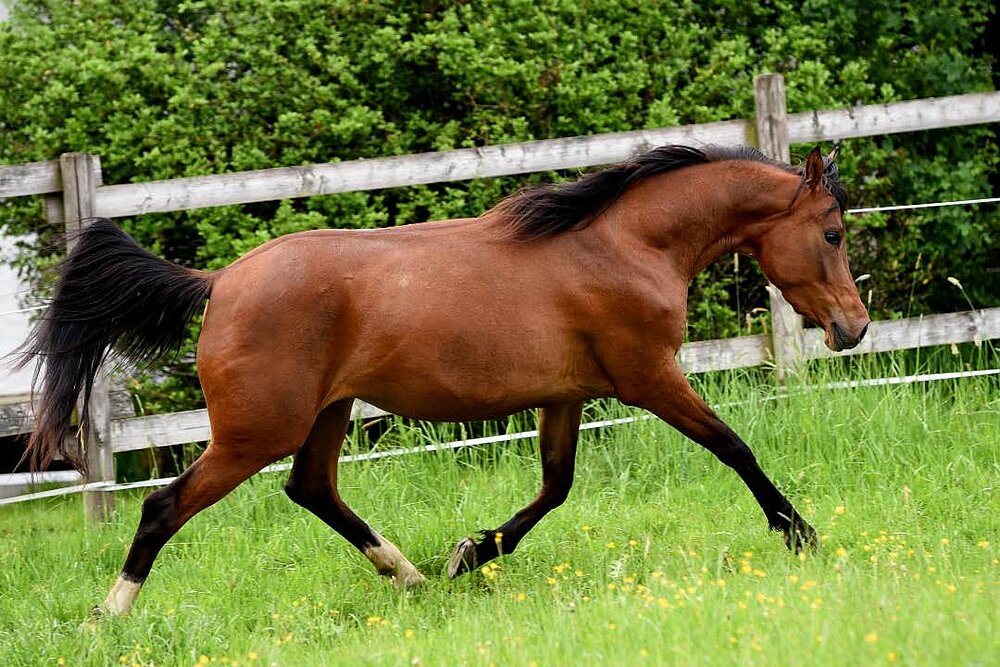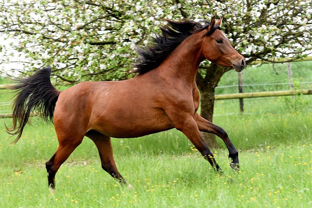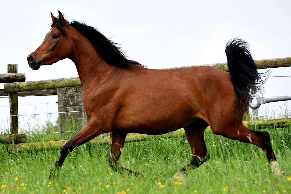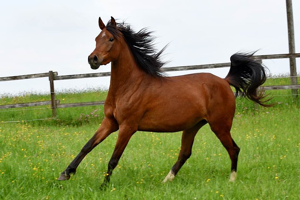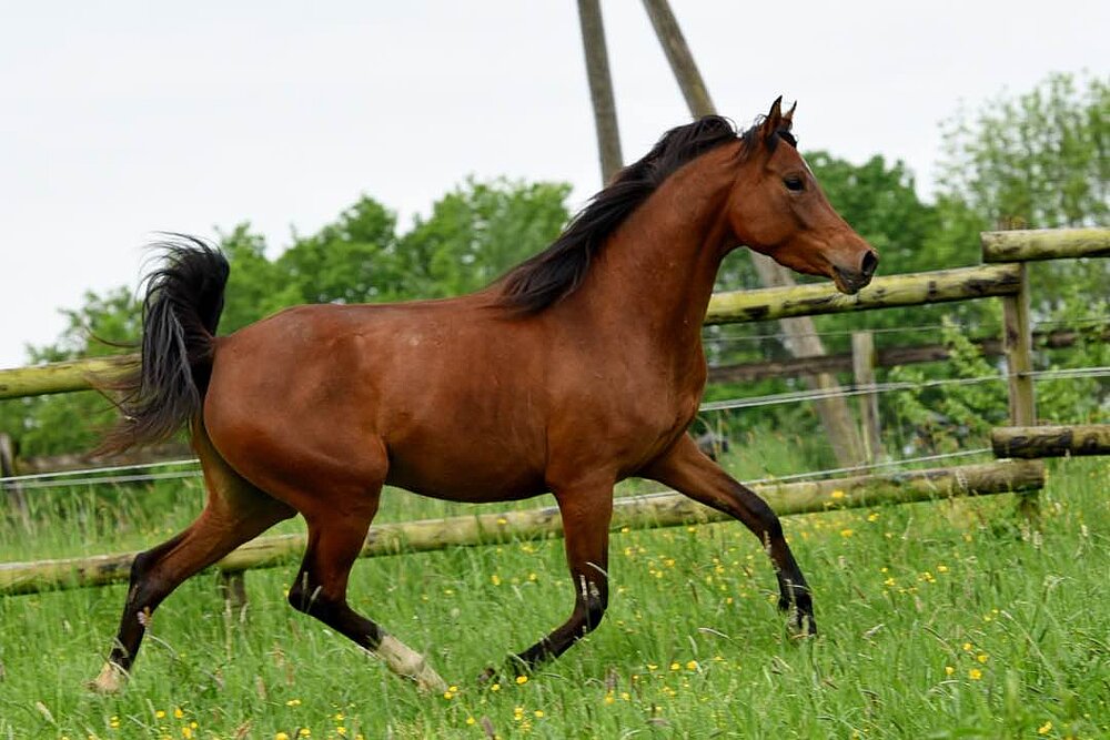 Wie ihr Name schon verspricht "schwebend, den Boden nie berührend" das beschreibt die große, rahmige elegante Stute wohl am besten. Ihr erstes Fohlen von unserem Sharaf Fareed AB ist ebenfalls groß uns rahmig, sehr im russischen Typ stehend und auch mit dem enormen Bewegungspotential ihrer Mutter ausgestattet.