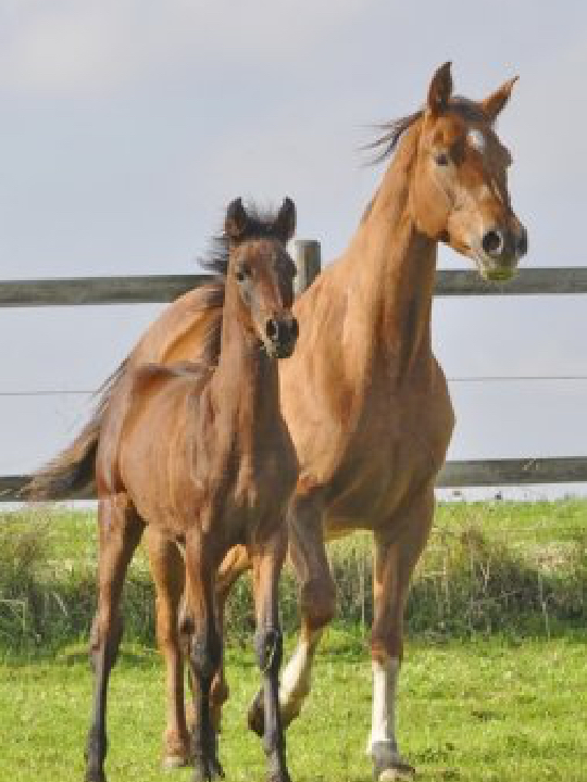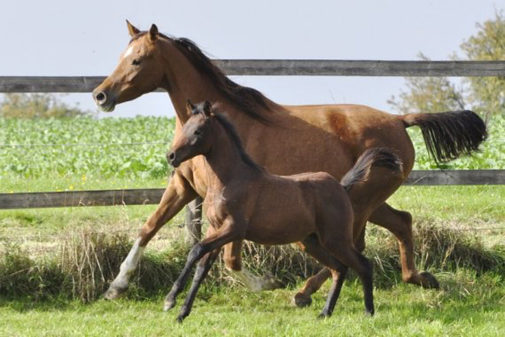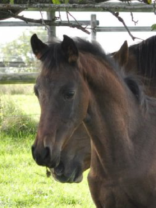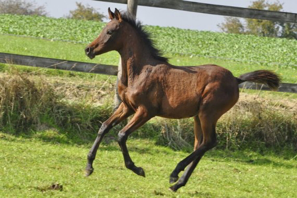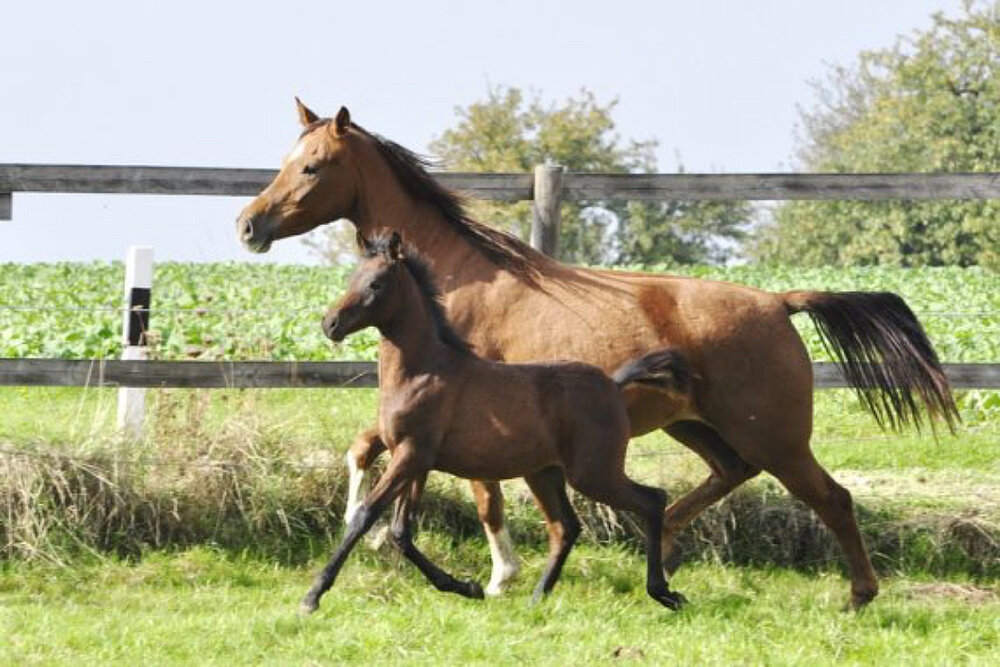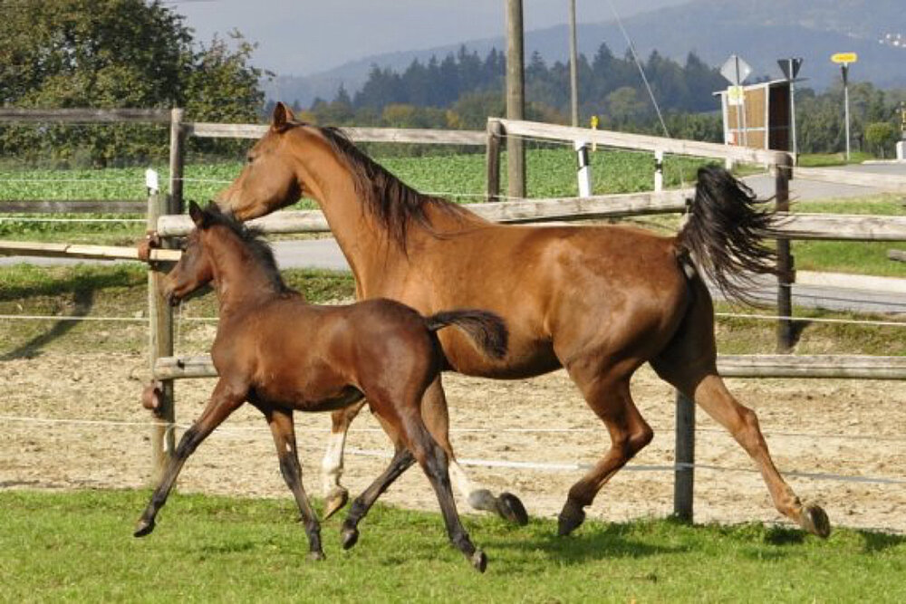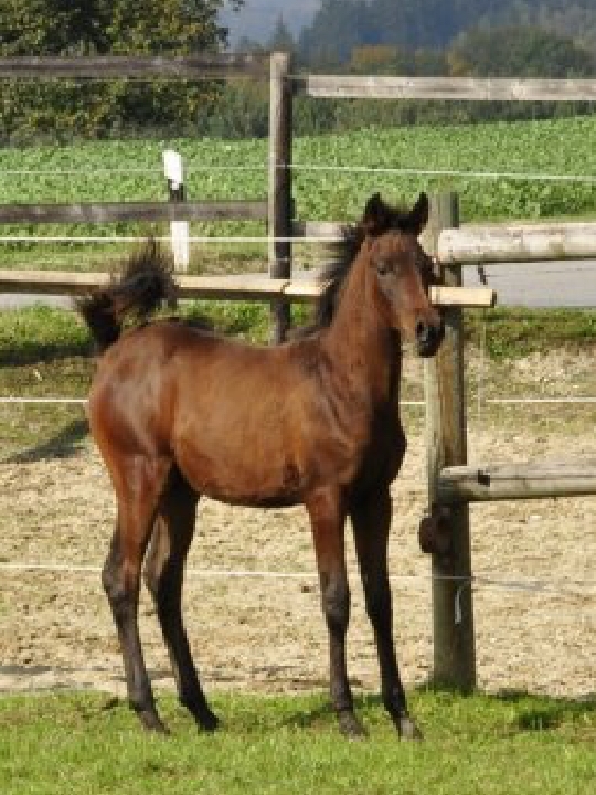 Erst viel zu früh geboren, und hat dann noch die Mama verloren. Ersatzmama Fortuna, wie ihr Name schon sagt ein "Glückspferd", eine der jungen Holsteiner Stuten am Gestüt, die selbst noch nie ein Fohlen hatte, hat sich dem kleinen Waisenkind angenommen zog ihn groß. Nur leider hatte sie eben keine Milch! Also mussten wir alle 2-3 Stunden ran. Doch die Mühe hat sich gelohnt, wie man sieht. Shah Haaleh wächst und gedeiht zu einem stattlichen jungen Mann heran, der das Leben in vollen Zügen genießt. Er hatte Glück im Unglück!